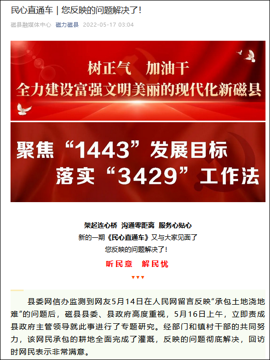 据河北磁县县委宣传部微信公众号“磁力磁县”5月17日消息,磁县县委网信办监测到网友5月14日在人民网留言反映“承包土地浇地难”的问题后,磁县县委、县政府高度重视,5月16日上午,立即责成县政府主管领导就此事进行了专题研究。经部门和镇村干部的共同努力,该网民承包的耕地全面完成了灌溉,反映的问题彻底解决,回访时网民表示非常满意。