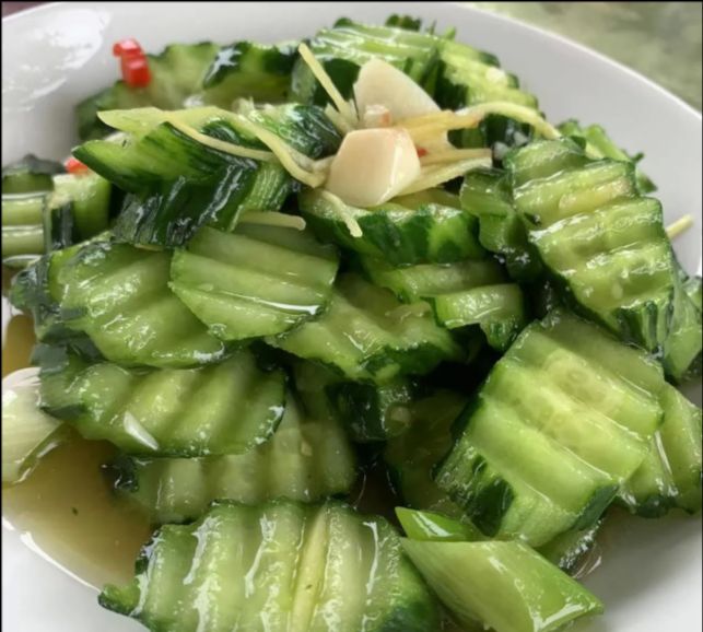 这个凉拌黄瓜也不错,不是把新鲜黄瓜拍烂切块而是做成一个个波浪形状,一点蒜末点缀,吃的就是黄瓜本身的香味,别看没有什么配料,却尽显食物本身的味道,又脆又解腻,配着小酒可以吃到停不下筷子。