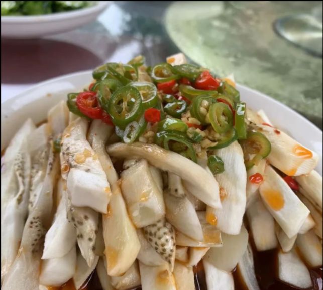 第二道菜是凉拌茄子,这个茄子去皮,切成条状上锅蒸熟,然后淋上辣椒圈和酱油等烧制的调料,不是那种重油重辣的口感,很清爽的感觉,又因为有辣椒的提味,变得更爽口开胃了。软糯的茄子又香又滑鲜香可口,是一道不折不扣的下饭菜。
