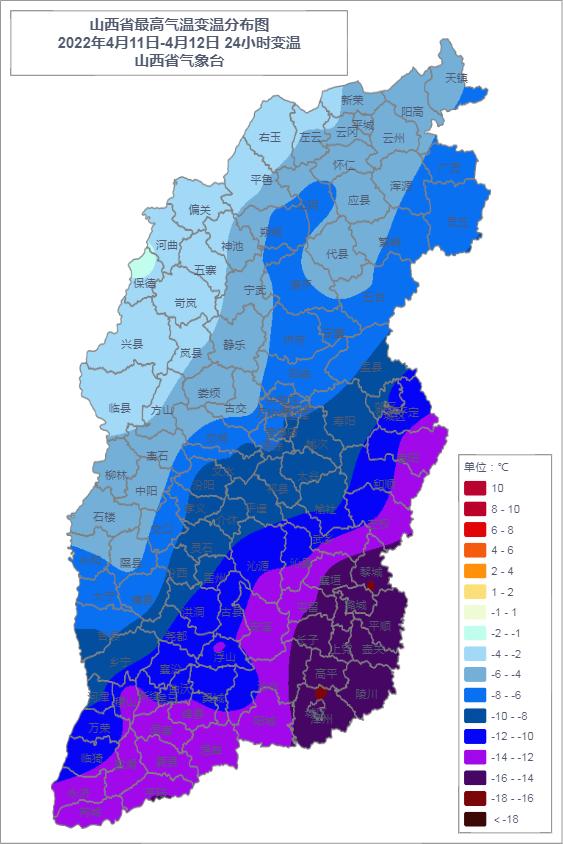 今天08时较昨天08时,各地均有所下降,降温幅度1.7℃-16.5℃,泽州降温幅度最大。有45个县(市、区)降温幅度在10℃以上,其中泽州、黎城、潞城、高平、壶关、上党、平顺、长子、潞州、襄垣超过15℃。
