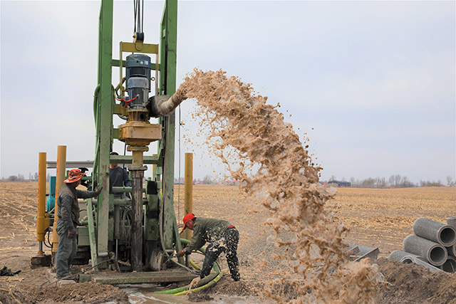 在兴安盟科右中旗新佳木苏木界仁达坝嘎查高标准农田现场,一辆打井机正在紧张施工,工人经过15分钟的打井作业,井口成功出水。水源井更新后,管道工程、排水工程、电力配套工程、地下水监测及信息化管理系统、渠道工程、田间道路工程及林业措施等将陆续开始施工。