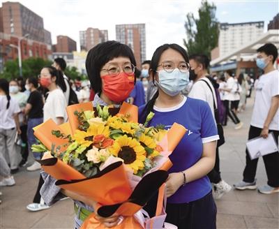 6月8日下午,在北京四中呼和浩特分校考点,随着考试结束的铃声响起,考生走出考场,家长用鲜花和拥抱迎接孩子。 呼和浩特日报记者 刘清羽 摄