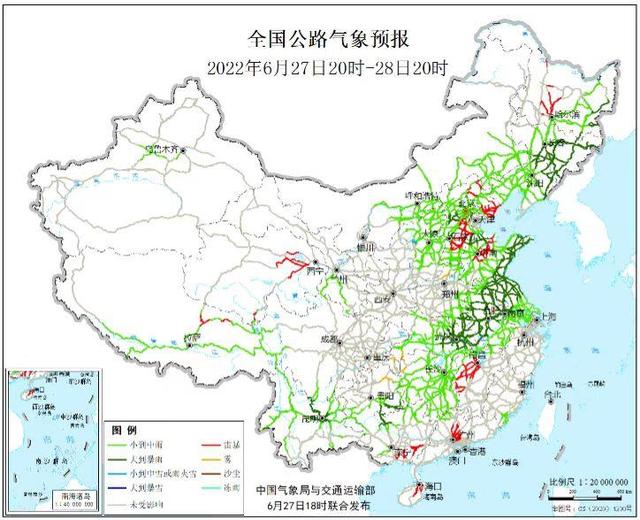 交通运输部出行提示:6月27日20时至28日20时,内蒙古东南部、辽宁东部、吉林大部、黑龙江东南部、西藏南部、华北中北部、黄淮东部、江淮、江汉东部、贵州东南部、广西西北部等地部分地区有中到大雨,其中,辽宁东部、吉林中东部、安徽中北部、江苏北部、湖北东部等地部分地区有暴雨或大暴雨。黑龙江中部、河北北部和中部、山东北部、青海东部、西藏北部、江西西北部、广东中部、广西东南部、海南岛北部等地局地有雷暴。另外,河南北部、湖北西南部、湖南西北部、贵州北部等地局地有雾。