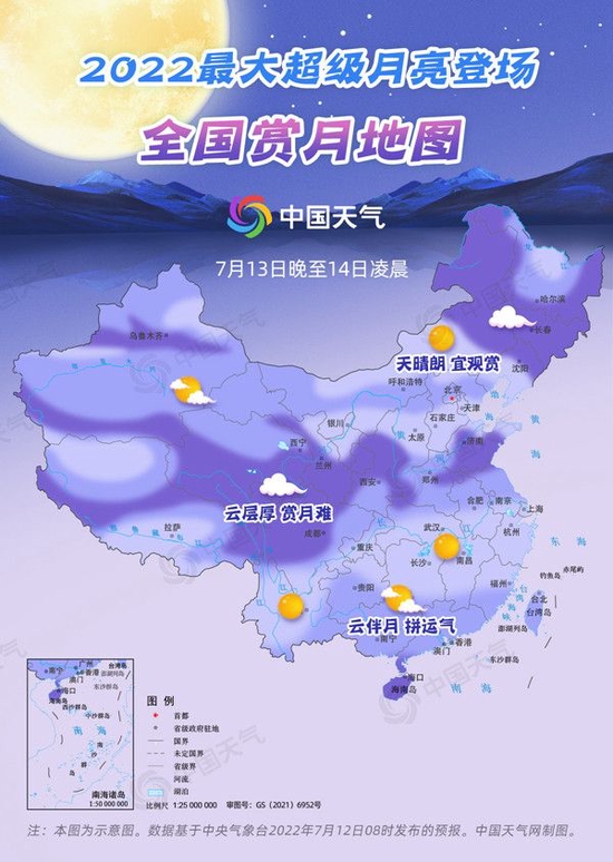 7月14日凌晨,本年度“最大满月”即将亮相夜空,这将是2022年最大的“超级月亮”。预计,7月13日晚上至14日凌晨为最佳观赏时间。如果天气晴朗,不少小伙伴都能欣赏到“满月”当空的景象。中国天气网特别推出全国赏月地图,看你家能否邂逅“超级月亮”。