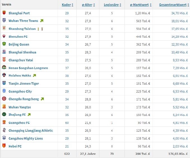 中超各队身价排名:海港三镇泰山居前三 河北垫底