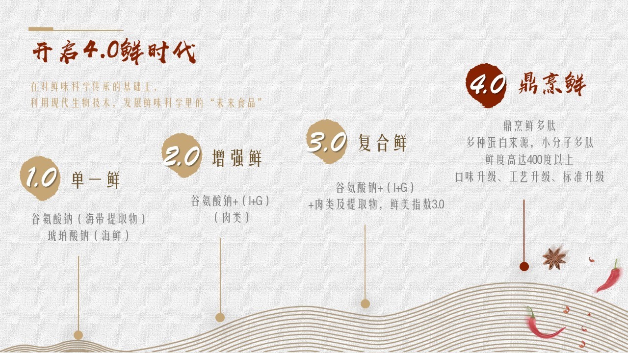 鲜味发展是起步于单一鲜,依次再到2.0增强鲜、3.0复合鲜。而东锦食品集团研发团队通过食材创新、工艺创新、设备创新的“三大创新”对鲜味产业进行了“四个升级”(即标准升级、工艺升级、鲜味升级、口感升级),成功开创第四代鲜味4.0产业——鼎烹鲜时代,实现了鸡精行业世界级的领先水平。